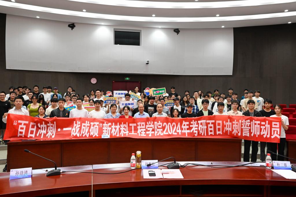 为了激发大四学生考研拼搏的精神,增强迎考备战的信心,新材料工程学院于9月13日下午在第一报告厅举办了考研百日誓师大会。院党委副书记赵惠明、副院长孙诗清、考研班主任刘劲松、学工办全体辅导员以及2024届考研学生参加了誓师大会,会议由辅导员杜二蓉主持。