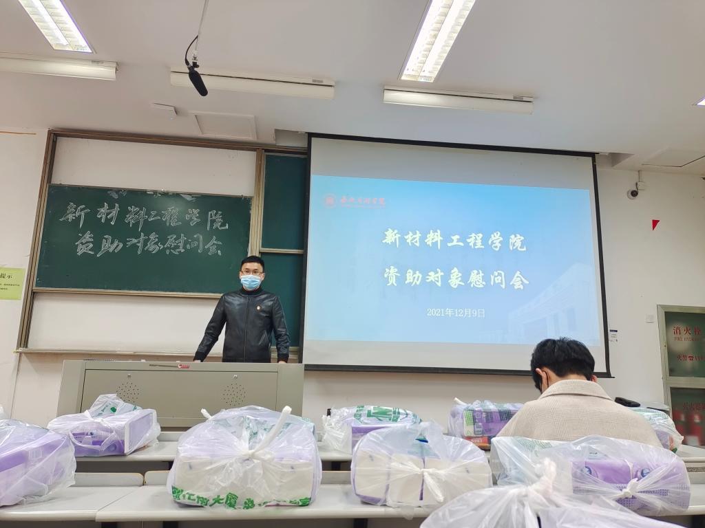2021年12月9日下午14点,新材料工程学院资助对象慰问会在教二A125教室如期举行。新材料工程学院学工办负责人王光辉老师主持本次慰问会。由于学校疫情防控要求,本次慰问会采用每班派2名资助对象代表的形式开展。