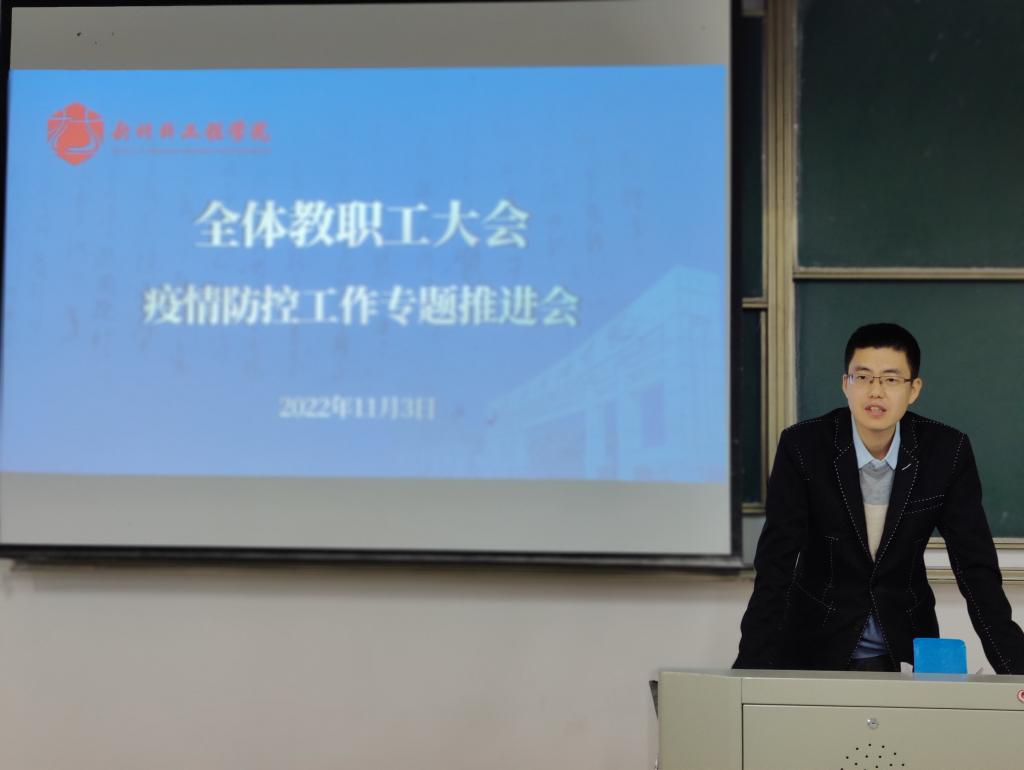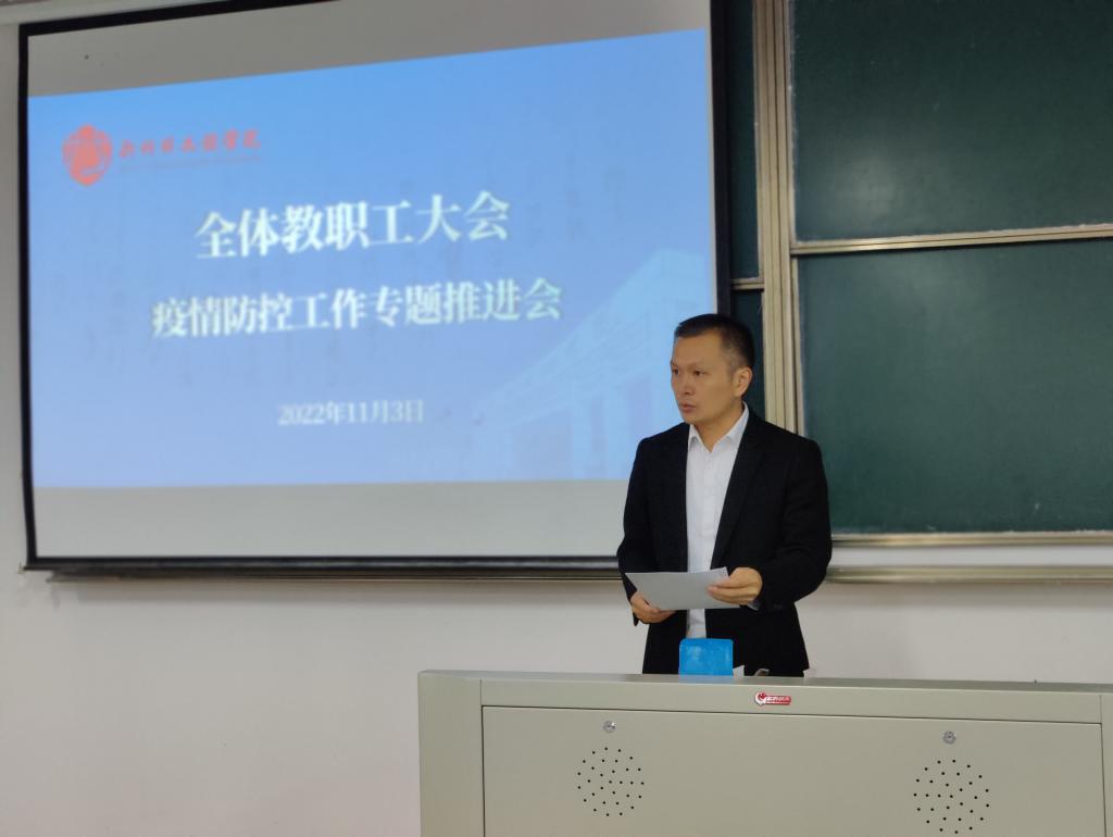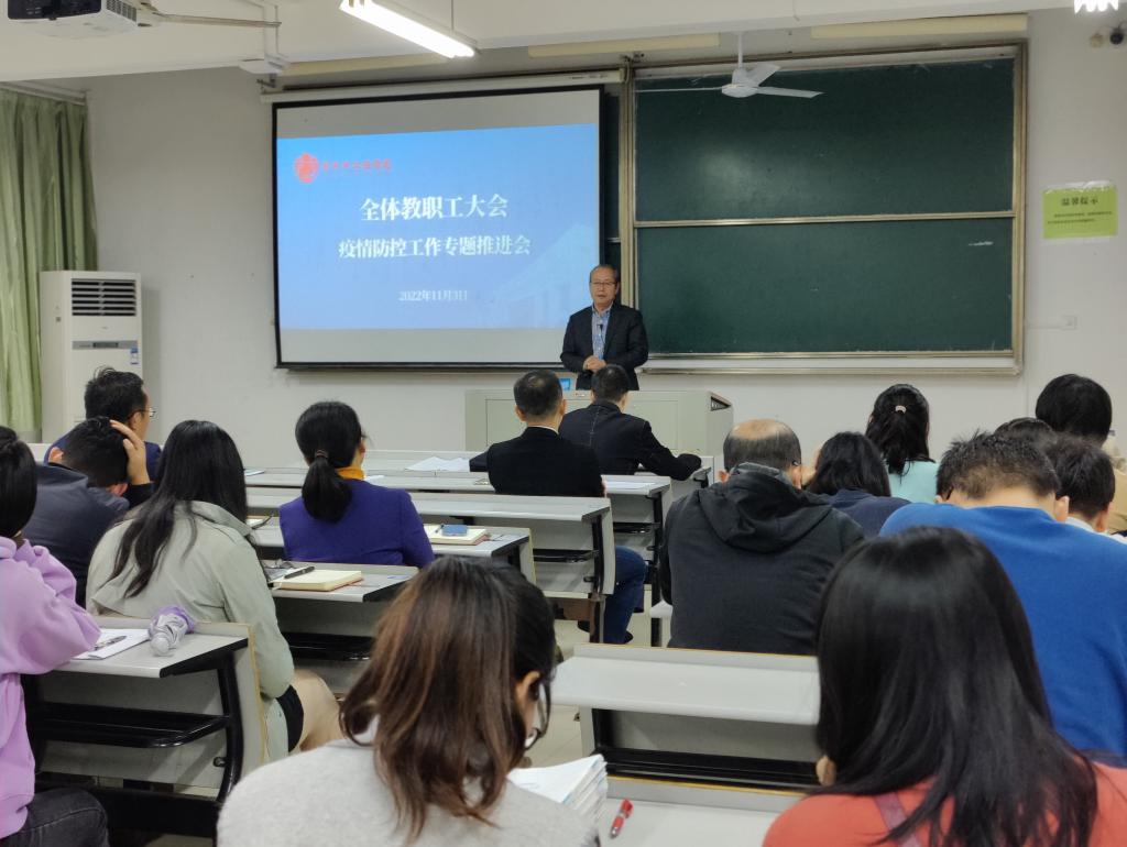 为深入贯彻落实上级和校党委决策部署,进一步补足疫情防控短板,压实防控责任,从严从实从细抓好疫情防控工作,11月3日下午,我院在教二B115召开疫情防控工作专题推进会。院党委书记郝涛主持并作重要讲话,院党委副书记赵惠明围绕疫情防控工作提出具体要求,副院长解春松宣布学院疫情防控领导小组架构及网格设置,全体教职工参加会议。